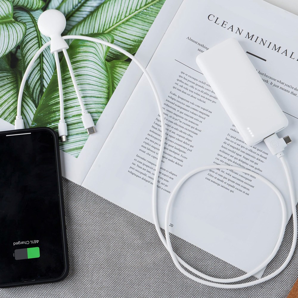 Duurzame oplaadset, kabel en powerbank zijn gemaakt met gerecycled plastic. De 7000 mAh powerbank kan uw telefoon tot 2,5 keer opladen. multi-oplaadkabel met USB, Lightning, Type C, Micro USB.