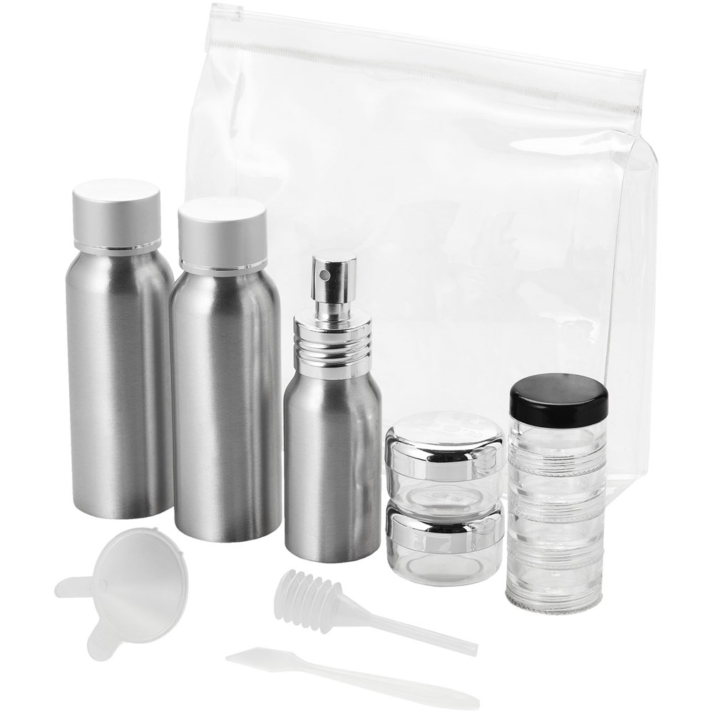 Bevat 2 x 80 ml aluminium flessen, 1 x 30 ml aluminium spray, 2 x 0,5 gram potjes, 1 x 4-laagse pot, een trechter, spatel en zuignapje. Accessoires verpakt in een aparte polybag. Decoratie is alleen mogelijk op de hoes.