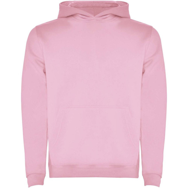 Tweekleurige hoodie met dubbele stof. Versterkte bedekte naden in de kraag en kangoeroezak. 1x1 elastaan rib in manchetten en tailleband. Verwijderbaar etiket. Het model is 120 cm en draagt maat 5/6.