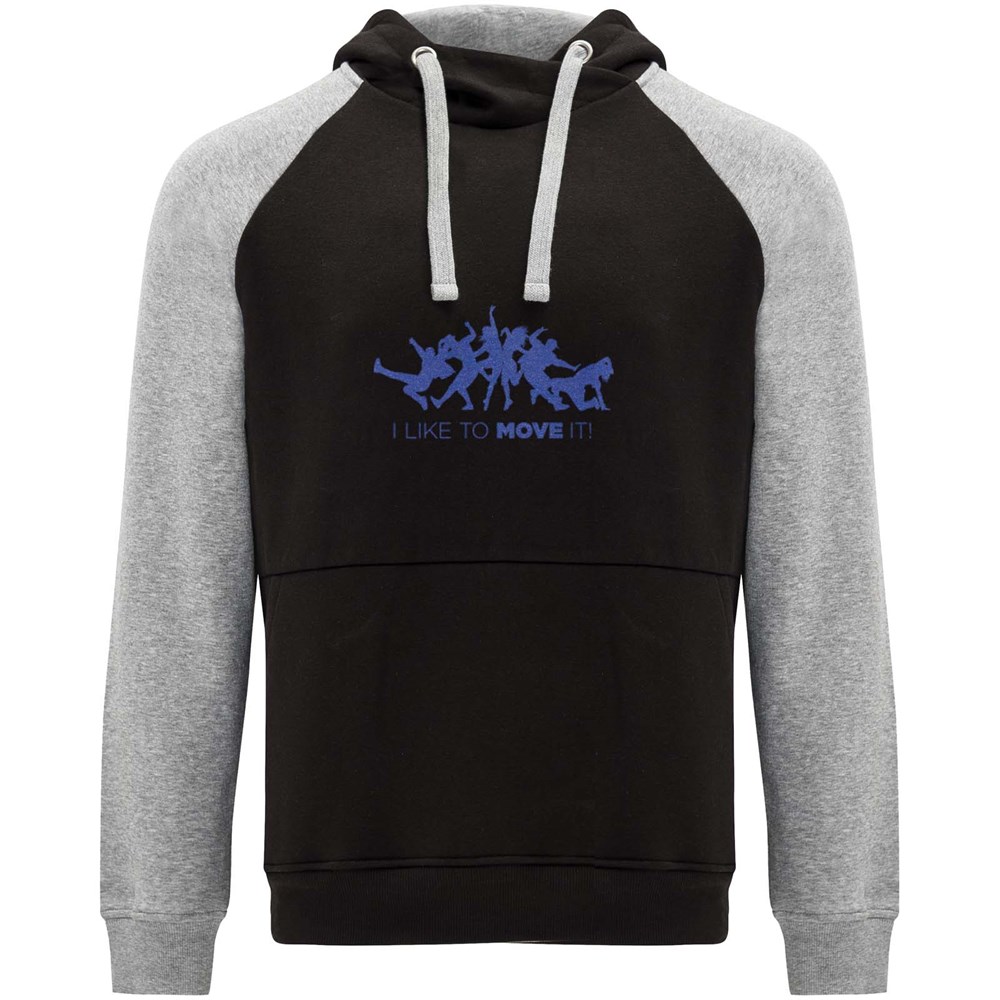 Tweekleurige unisex hoodie. Capuchon met gekruiste hals en metalen oogjes. Contrasterende binnenkant van de capuchon, trekkoord en raglanmouwen. Kangoeroezak. Manchetten en zoom van 1x1 ribgebreid elastaan. Verwijderbaar label.