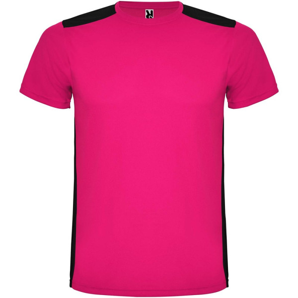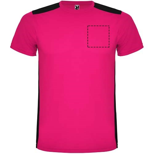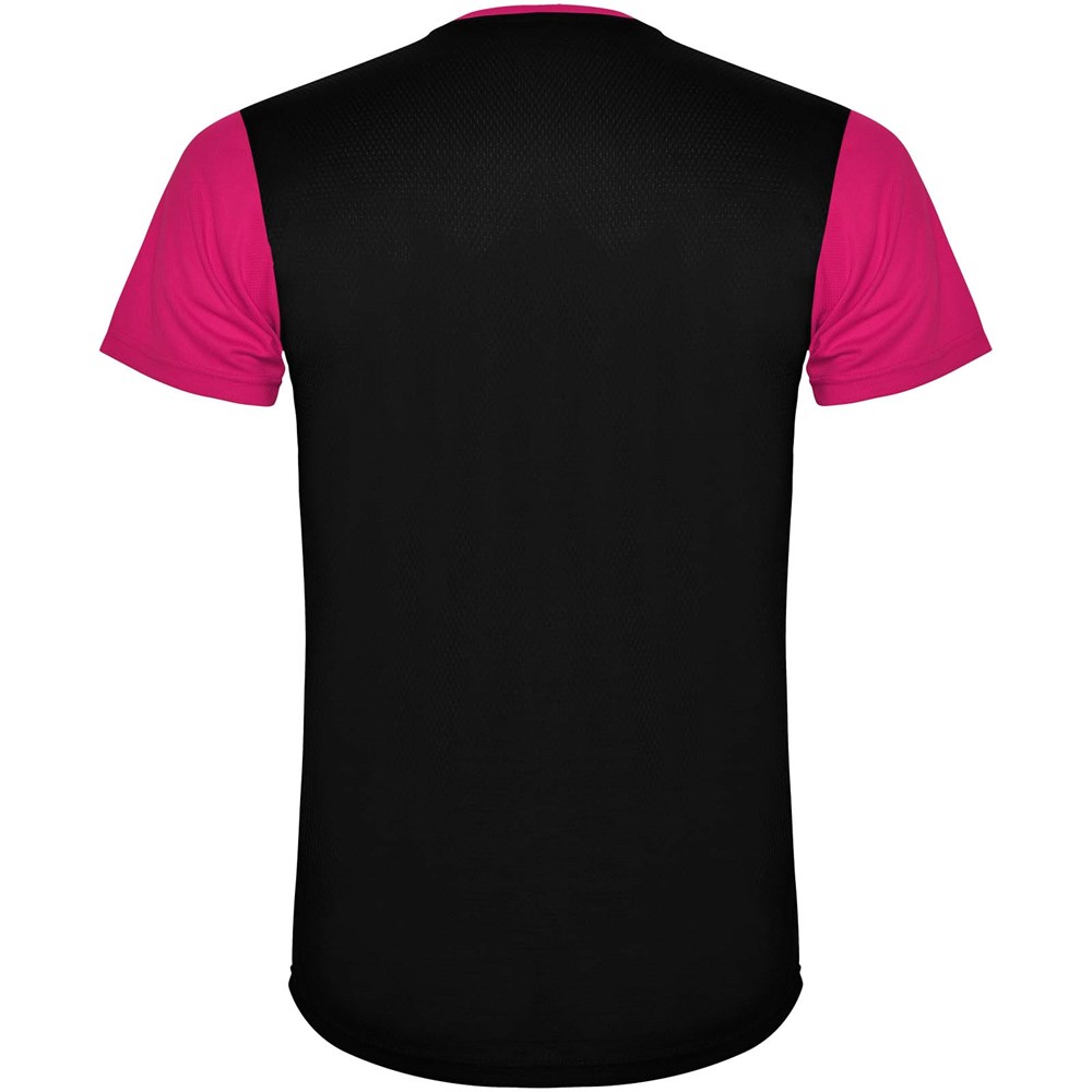 Gemakkelijk drogende, technische en ademende stof. Ronde hals. Combinatie van twee polyesterstoffen op de rug en schouders. Birdseye-stof aan de voorkant en ademende 3D-meshstof aan de achterkant. Stof voorbereid voor vochtopname. Decoratieve zigzagsteek aan de zijkanten en schouders. Rugpatroon is iets langer. Verwijderbaar label.