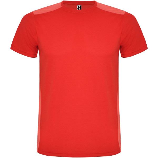 Gemakkelijk drogende, technische en ademende stof. Ronde hals. Combinatie van twee polyesterstoffen op de rug en schouders. Birdseye-stof aan de voorkant en ademende 3D-meshstof aan de achterkant. Stof voorbereid voor vochtopname. Decoratieve zigzagsteek aan de zijkanten en schouders. Rugpatroon is iets langer. Verwijderbaar label.