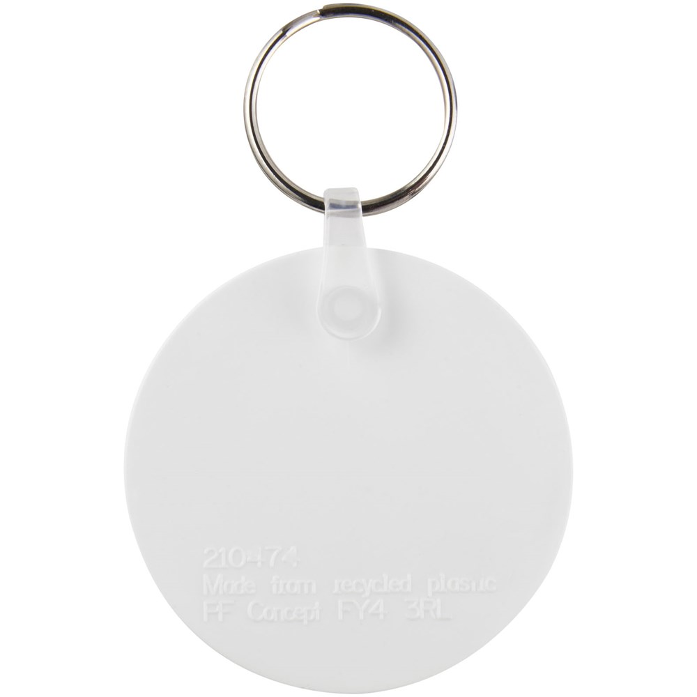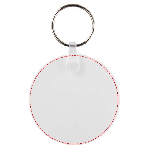 Witte cirkelvormige sleutelhanger met metalen gesplitste sleutelring. De metalen lusring biedt een vlak profiel dat ideaal is voor de post.