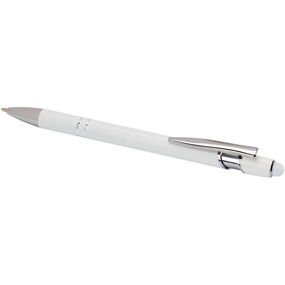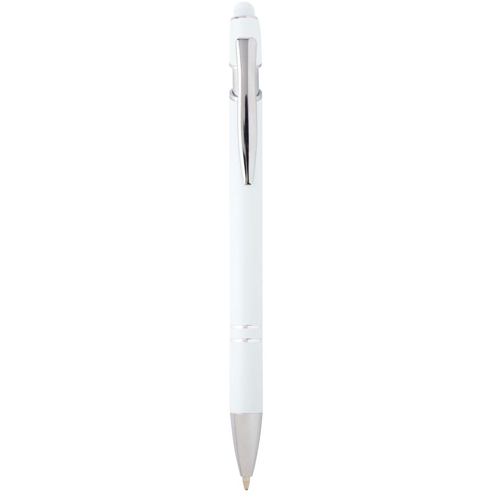 De Kish balpen met zilveren afwerking heeft een houder van gerecycled aluminium met een siliconen touch stylus. Gerecycled aluminium vermindert de hoeveelheid afval op stortplaatsen en draagt bij aan het behoud van natuurlijke hulpbronnen, met als doel de uitstoot van broeikasgassen te verminderen. Inktkleur: Blauw. Schrijflengte: 800 meter. Stiftmaat: 1,0 mm.