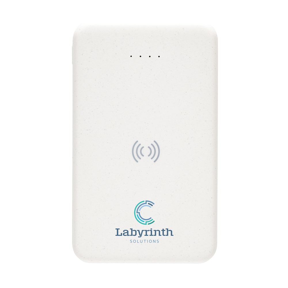 5.000 mAh pocket formaat powerbank met 5W draadloze oplader waarvan de behuizing is gemaakt van RCS-gecertificeerd gerecycled ABS-plastic. RCS (Recycled Claim Standard) is een standaard om de gerecyclede inhoud van een product te verifiëren gedurende de hele toeleveringsketen. Totaal gerecycled materiaal: 26% op basis van het totale gewicht van het artikel. Wanneer de powerbank volledig is opgeladen, levert deze voldoende energie om uw mobiele telefoon tot twee keer op te laden. De powerbank bevat een duurzame grade A 5.000 mAh high-density lithium-polymeerbatterij. De vermogensindicatoren geven het resterende energieniveau aan, zodat u altijd weet wanneer u moet opladen. Micro USB-ingang 5V/2A; Type-C-ingang 5V/2.4A; USB-uitgang 5V/2.4A, Type C-uitgang: 5V/2A. Het artikel en de accessoires zijn PVC-vrij. Inclusief RCS-gecertificeerde gerecyclede TPE-oplaadkabel. Verpakt in FSC®-mixverpakking