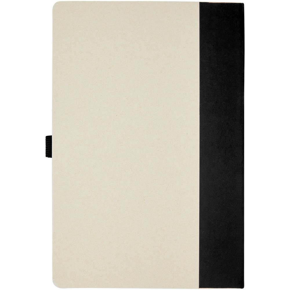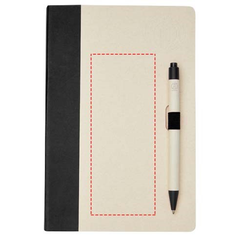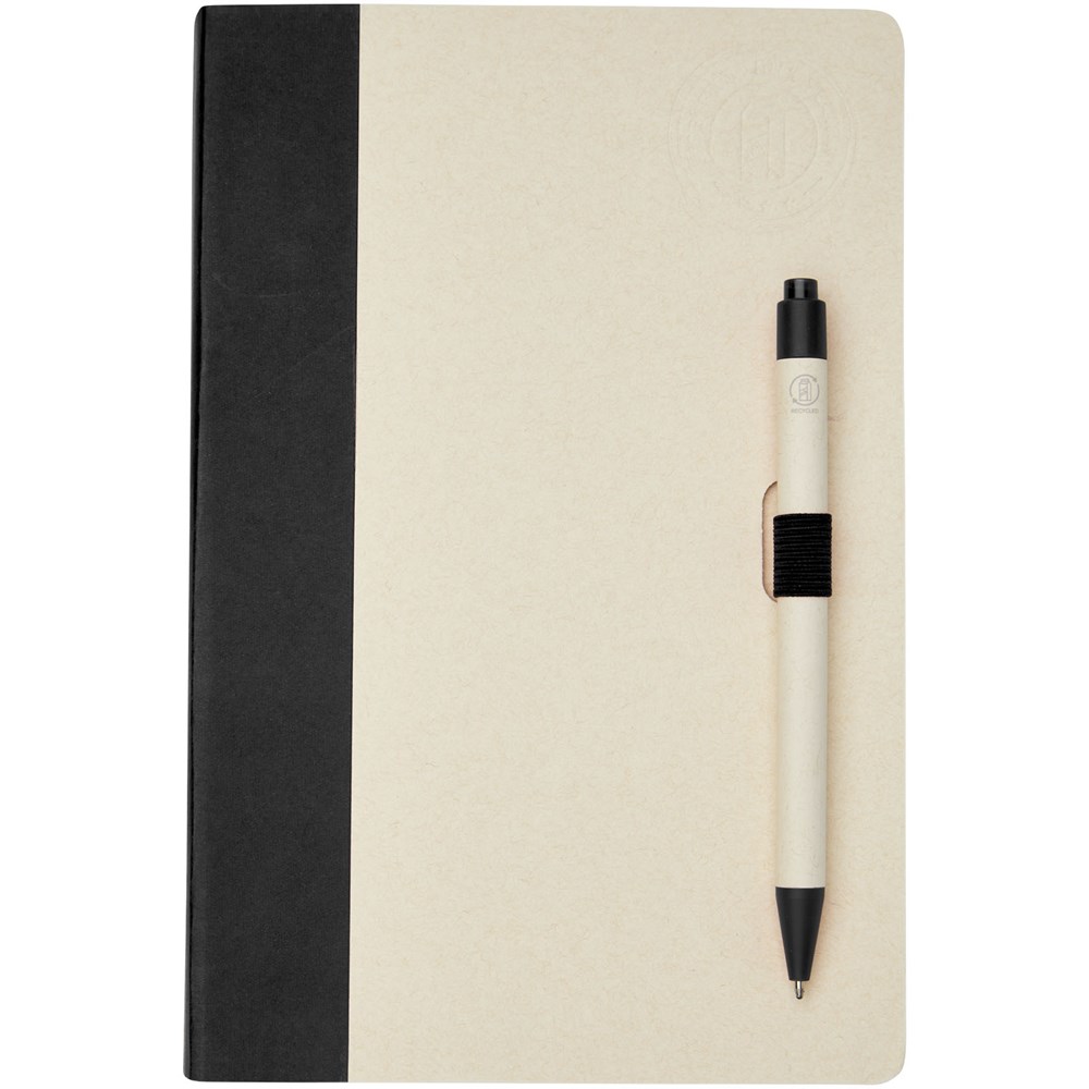 Set van A5 notitieboek en balpen. Het notitieboek heeft 80 gelinieerde vellen (80 g/m²) gemaakt van gerecyclede melkpakken (tot 70%), een rug van gekleurd papier en een pennenlus. In de pennenlus zit een balpen met klikmechanisme in bijpassende kleur van het notitieboek. De pen heeft een houder van hetzelfde gerecyclede melkpakmateriaal en de knop, clip en punt zijn gemaakt van gekleurd PLA kunststof. De pen heeft een zwarte vulling aan de binnenkant. Gebruikte melkpakken worden ingezameld, gesorteerd, verwerkt en omgezet in papier, waardoor afval echt iets nuttigs wordt.