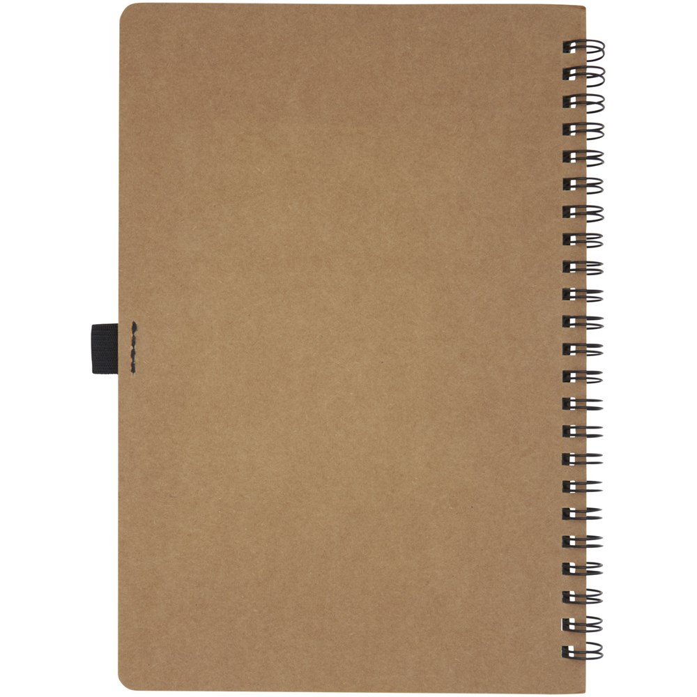 Wire-o-notitieboek in A5-formaat met cover uit gerecycled karton en penlus. Bevat 70 vellen 60 g/m² gelijnde binnenpagina's gemaakt van steen. Steenpapier is 100% boomvrij en het productieproces verbruikt minder energie in vergelijking met gerecycled of nieuw pulppapier. Het papier is water- en scheurbestendig en heeft een natuurlijke witte kleur (er is geen bleekmiddel gebruikt).