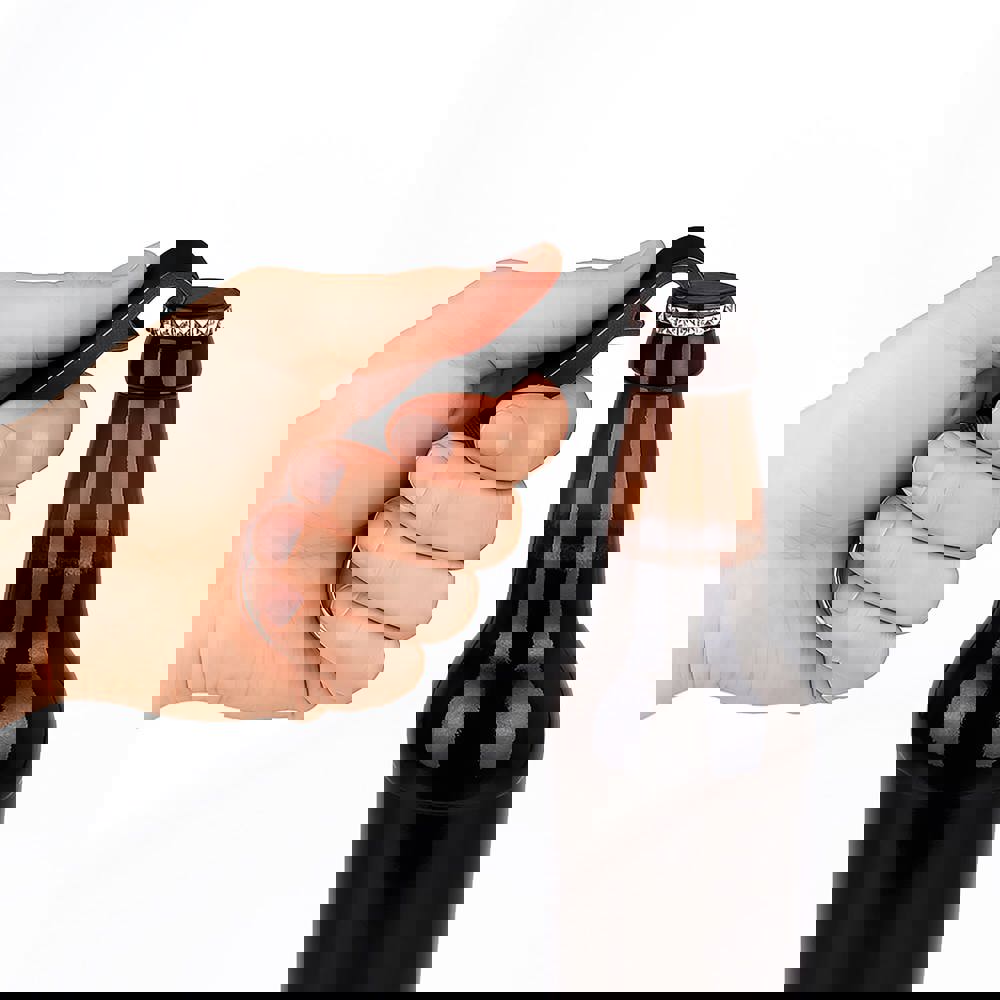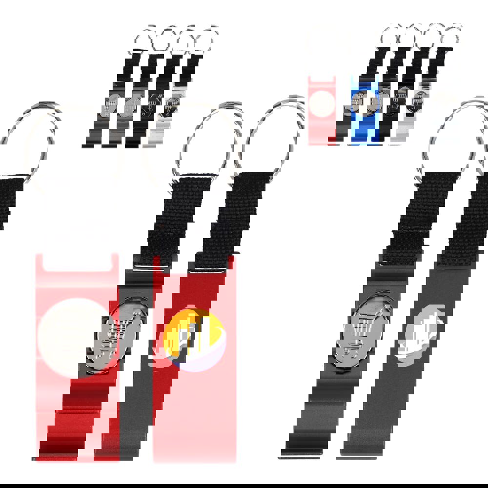 Aluminium 3-in-1 sleutelhanger met flesopener, telefoonstandaard en afneembare winkelwagenmunt, geschikt voor de meeste winkelwagens in West-Europa. Een compact en praktisch promotieartikel.