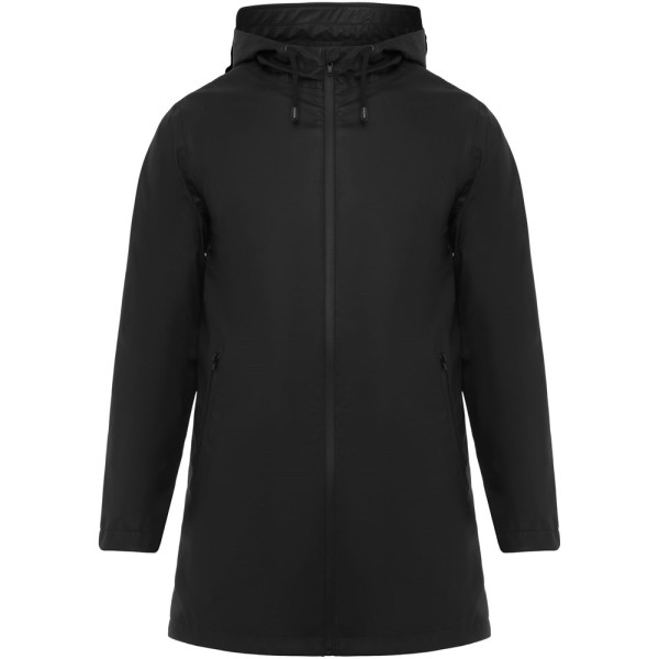 Waterdichte regenjas. Capuchon met klep. Door hitte gesealde ritsen en naden. Contrasterende details in zwart. Twee zijzakken met rits. Split aan de achterkant. Verwijderbaar etiket. Waterbestendig. Het model is 185 cm en draagt maat M.