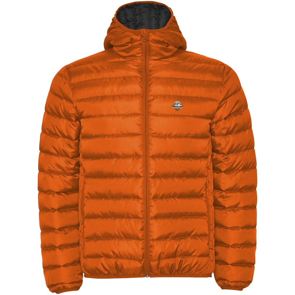 Gewatteerde herenjack met dons en aansluitende capuchon. Omgekeerde ritsen met bijpassende kinbeschermer. Twee voorzakken met rits. Bijpassende elastische bies in manchetten, zoom en capuchon. Contrasterende binnenvoering. Licht en opvouwbaar kledingstuk. Waterafstotend. Winddicht model.
