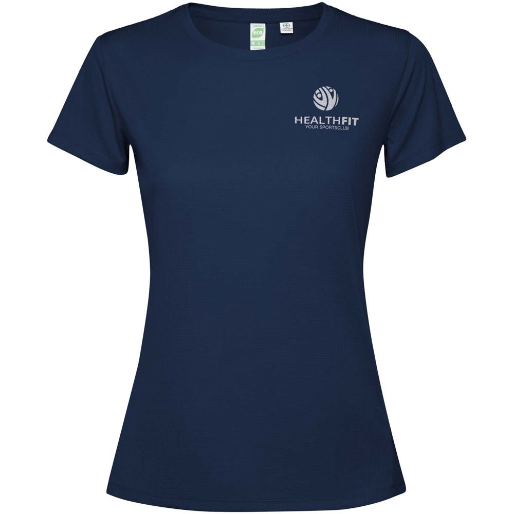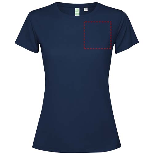 Getailleerd technisch T-shirt met korte mouwen voor dames. Kraag met bijpassende naden. De zoom aan de achterkant is iets langer dan aan de voorkant. Zijnaden naar voren verschoven.