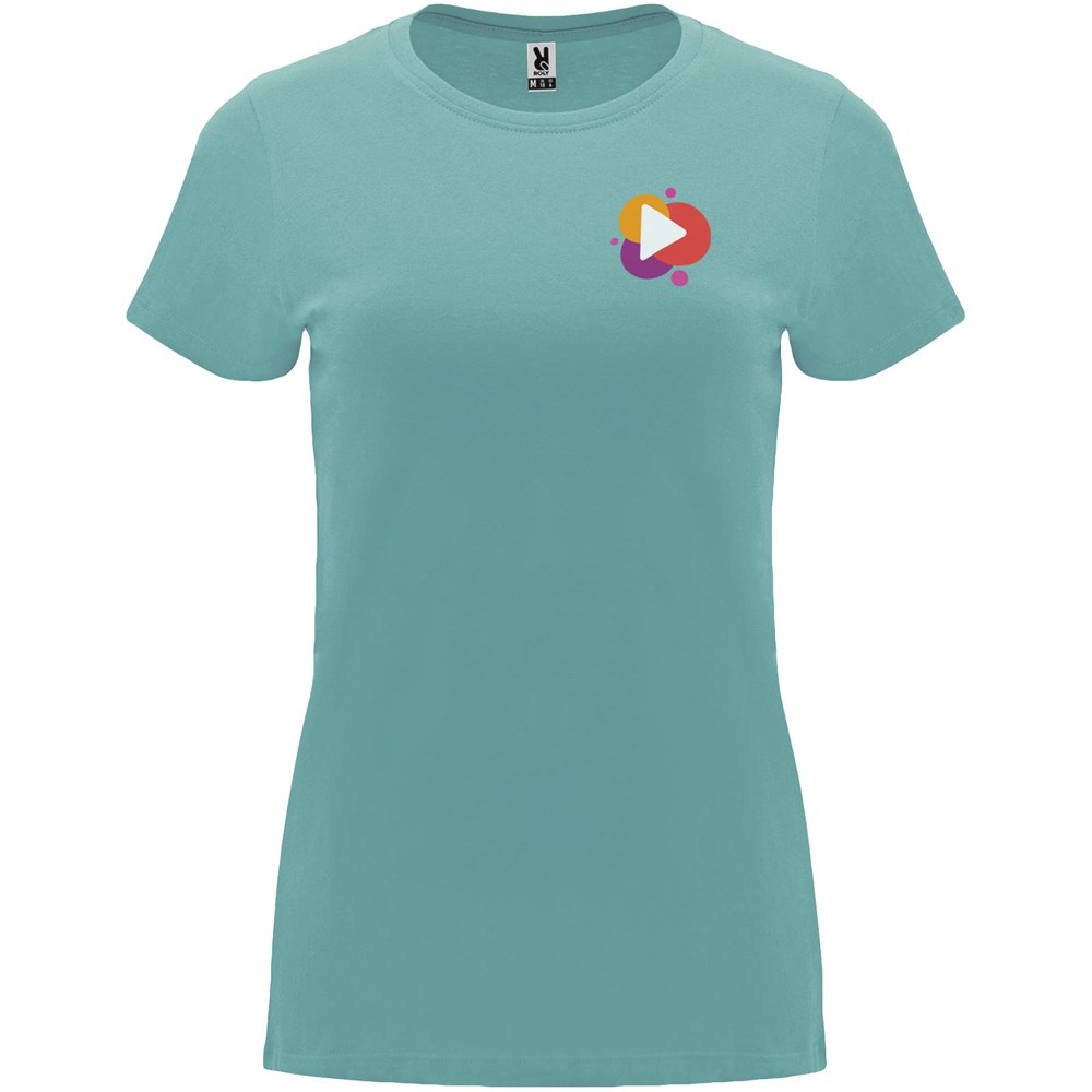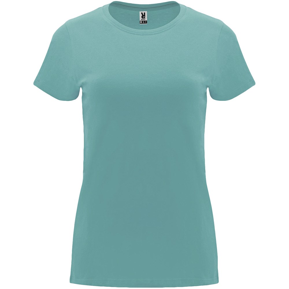 Getailleerd T-shirt met korte mouwen voor dames. 1x1 geribde ronde hals. Versterkte bedekte naden in de kraag. Verwijderbaar etiket.