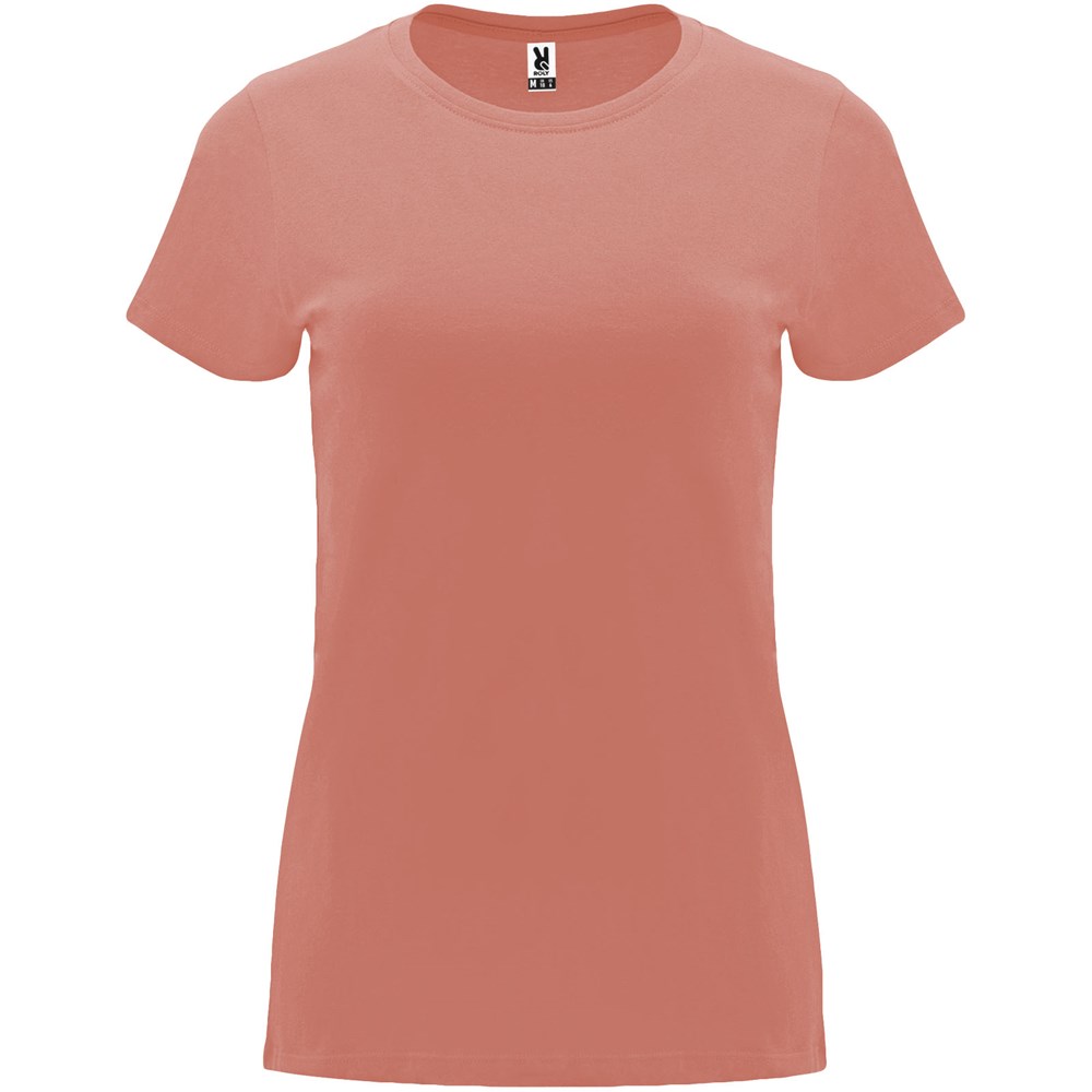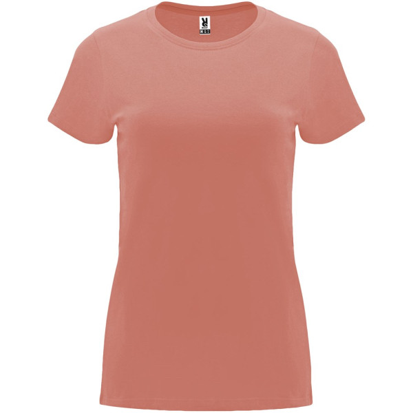 Getailleerd T-shirt met korte mouwen voor dames. 1x1 geribde ronde hals. Versterkte bedekte naden in de kraag. Verwijderbaar etiket.