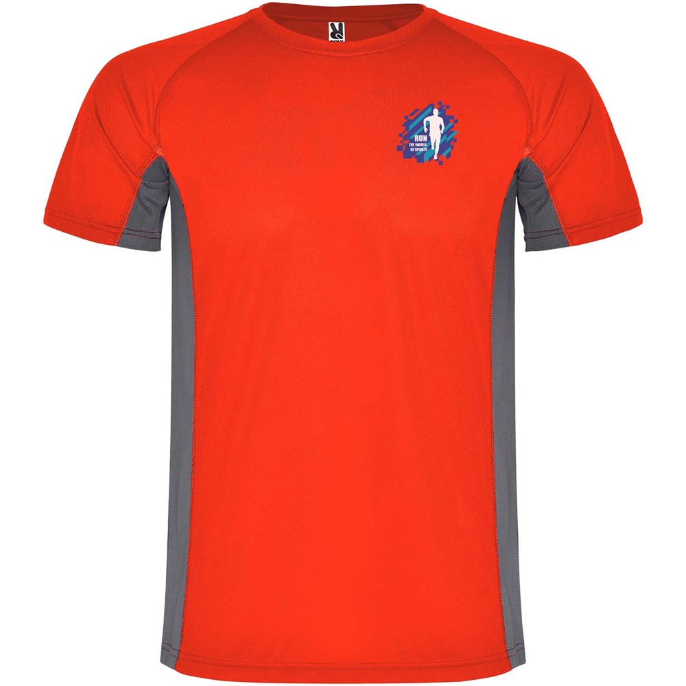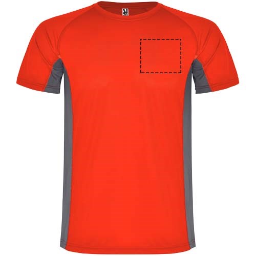 Technische en ademende stof. Een combinatie van twee polyesterstoffen: Hoofdstof van birdseye-stof, zijpanelen en binnenmouw van micro-geperforeerde stof. Ronde hals met binnenin versterkte bedekte naden. Verwijderbaar label.