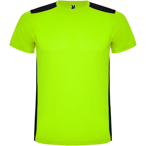 Gemakkelijk drogende, technische en ademende stof. Ronde hals. Combinatie van twee polyesterstoffen op de rug en schouders. Birdseye-stof aan de voorkant en ademende 3D-meshstof aan de achterkant. Stof voorbereid voor vochtopname. Decoratieve zigzagsteek aan de zijkanten en schouders. Rugpatroon is iets langer. Verwijderbaar label.
