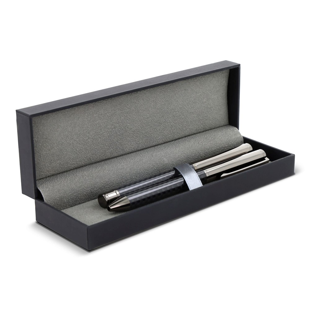 Een schrijfset geleverd in een mooie geschenkverpakking. Deze set bestaat uit een metalen balpen en een rollerbal.