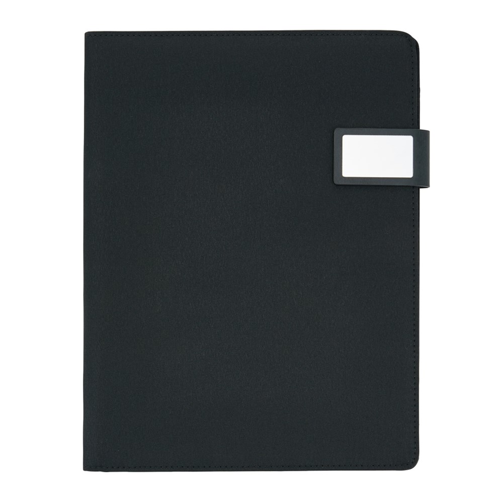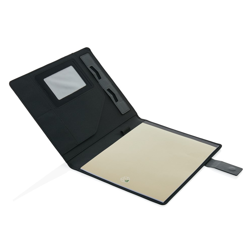 A4 tech portfolio met luxe magnetische metalen sluiting. Met slimme standaard voor je tablet of smartphone, telefoon houder met doorzichtig venster waarmee je nog steeds je smartphone kan bekijken en besturen. Geschikt voor de meest gangbare telefoons zoals de iPhone 6 & Samsung S6. Sleeve voor documenten, 2 kaarthouders en een penhouder. Inclusief A4 notitieblok van gerecycled papier.