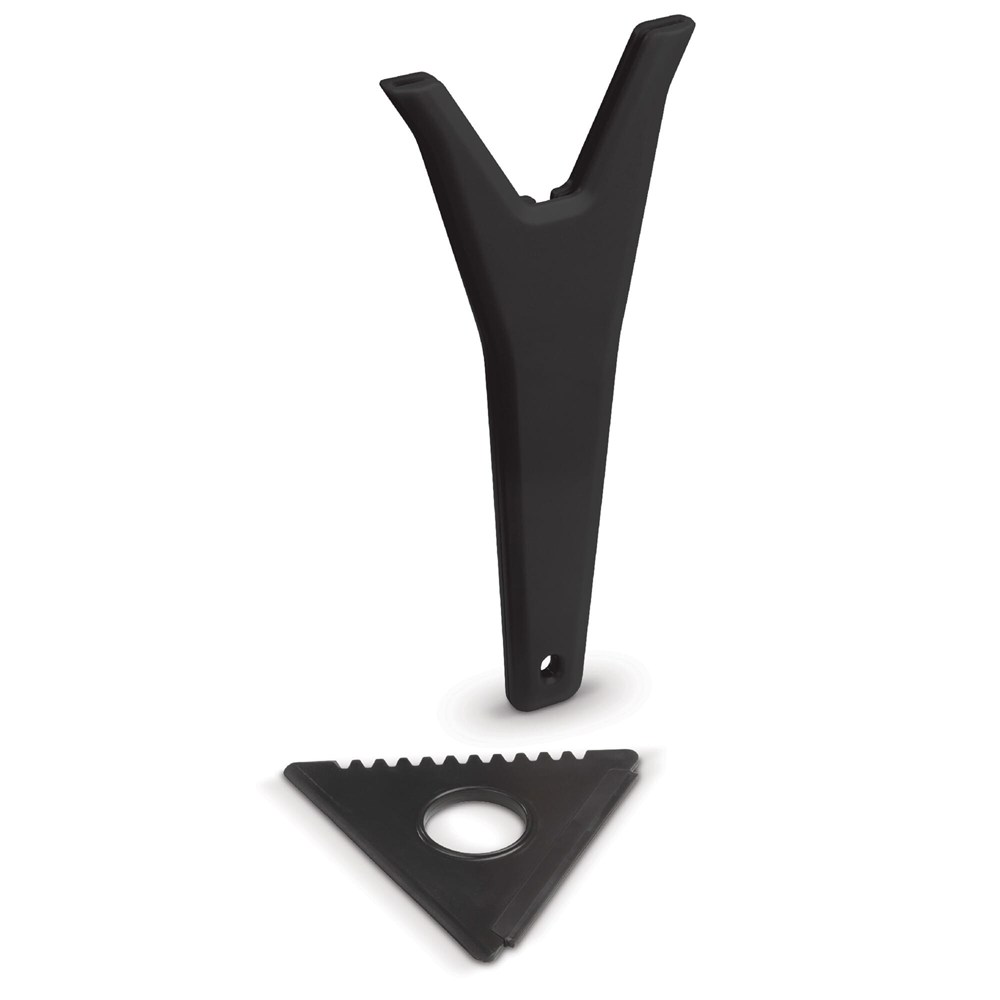 IJskrabber met verwisselbare driehoek voor het verwijderen van sneeuw, ijs en condens. Het handvat heeft een groot bedrukkingsoppervlak.